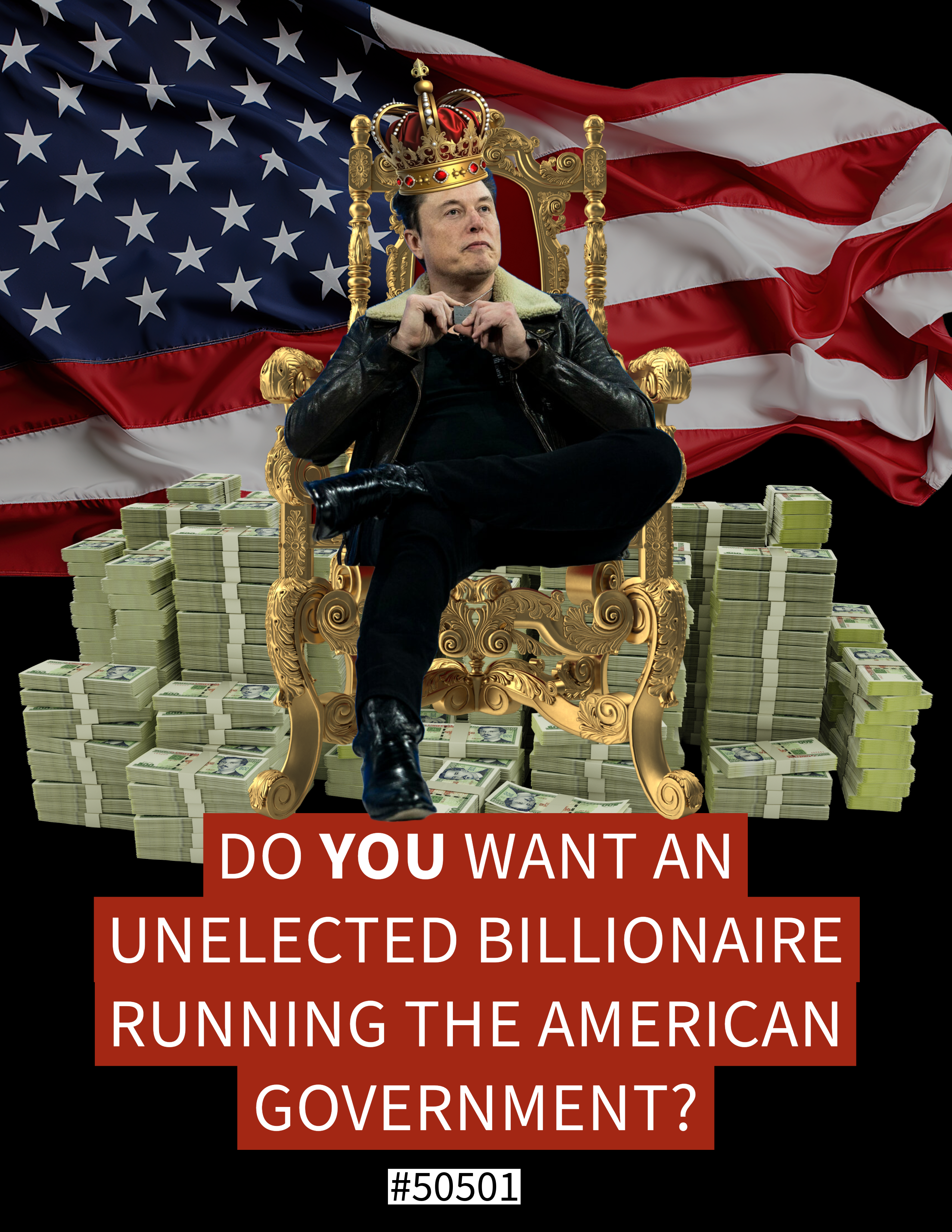 A visual warning about the dangers of unelected billionaires influencing the American government. Elon Musk and the Threat of Billionaire Control elon-musk-unelected-billionaire-government-50501Download Post date February 20, 2025 Posted in 50501 Tagged with english Previous post: Trump, Musk, and Russia: A Threat to the American Dream Next post: Yes to Democracy, No to Oligarchy and Authoritarianism